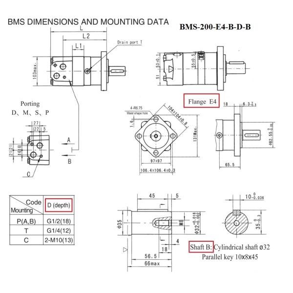 This Hydraulic Winch Motor is a dis valve type motor. It's displacement start from 80 ml/r to 375 ml/r, speed from 200 rpm to 988 ml/r, torque from 190 N.m to 751 N.m, max output from 11.8 kw to 23.5 kw, max flow from 65 L/min to 90 L/min. Below is the detail specifications of this BMS hydraulic winch motors.